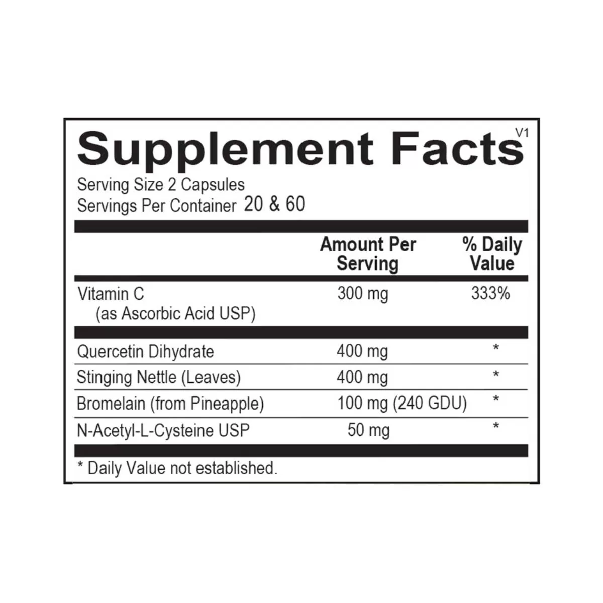 Bromelain – Bromelain enhances the absorption of quercetin and supports mucosal tissue health. Bromelain is a plant enzyme naturally found on the stem and fruit of the pineapple plant. Bromelain is a proteolytic (protein-digesting) enzyme that aids in in the breakdown of large protein complexes, including antigenic compounds and has been shown to enhance absorption of quercetin. Bromelain has also been shown to reduce circulating allergenic protein complexes associated with hyper-immune sensitivity and seasonal discomfort.